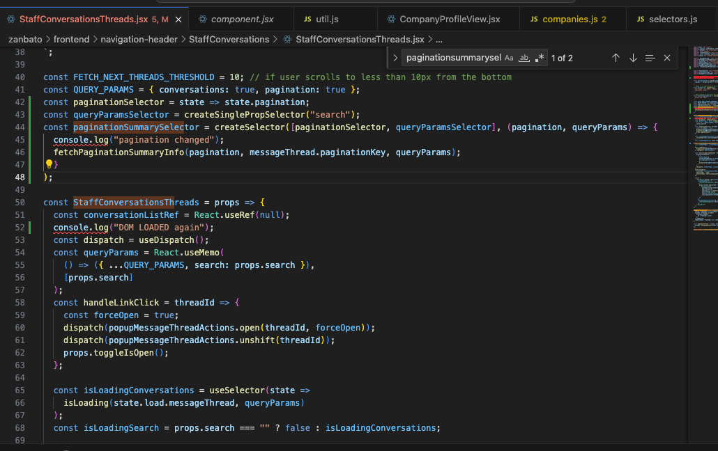 Here the code âpagination changedâ only runs when the search prop changes. NOT when the dom re renders. this is because itâs outside the component and the const pagainationsummaryselector doesnât run when the DOM reloads.