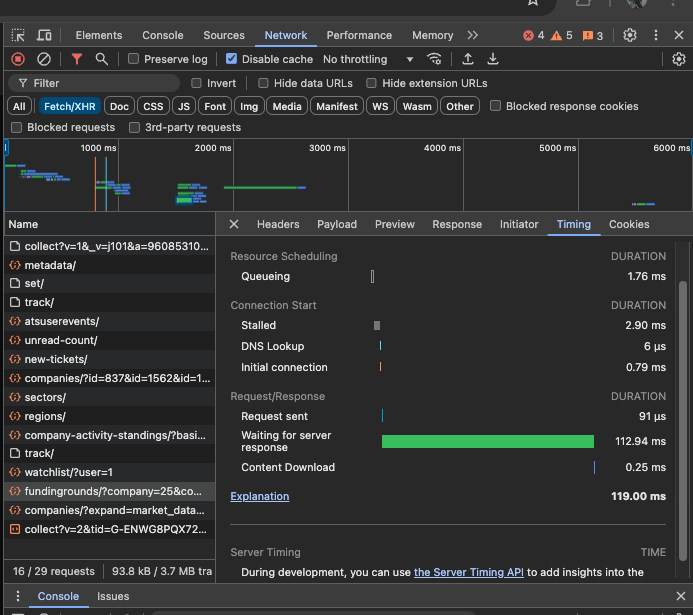 By querying for just the company ids. I was able to save 80ms instead of querying for all the fundingrounds.
