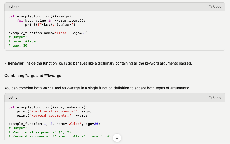 • **kwargs allows a function to accept an arbitrary number of keyword arguments, collected into a dictionary.